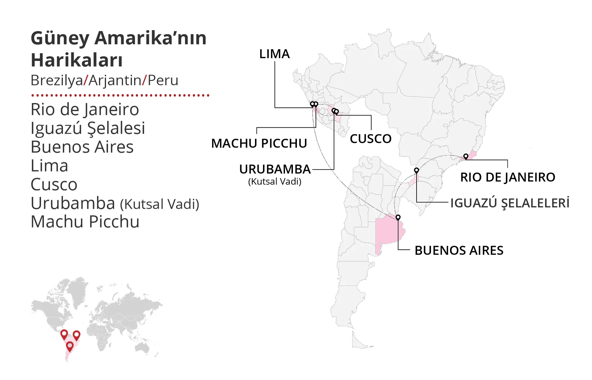 Güney Amerika’nın en ikonik destinasyonlarında unutulmaz bir maceraya çıkın. Rio de Janeiro’nun enerjik atmosferinden Iguazú Şelalesi'nin görkemine, Buenos Aires’in tango dolu sokaklarından Lima ve Cusco’nun tarih kokan meydanlarına kadar bu turda her an keşfetmeye değer. Kutsal Vadi’nin mistik güzellikleri ve Machu Picchu’nun antik zirvesi, bu yolculuğu eşsiz kılacak.
