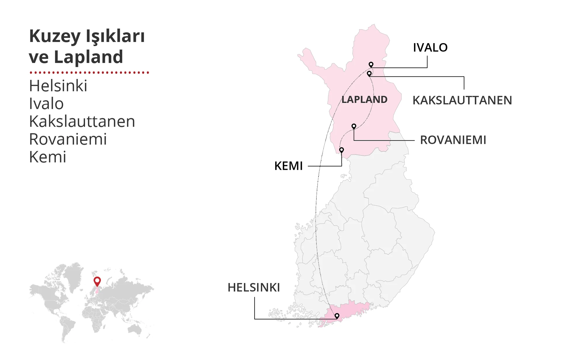 Büyüleyici Kuzey Işıkları'nın peşinde, karlarla kaplı masalsı Lapland'ın kalbine doğru unutulmaz bir yolculuğa çıkın. Helsinki'nin tarihi ve modern yüzünü keşfederek başlayan bu macera, İvalo'nun eşsiz doğası, Kakslauttanen'in ünlü cam igloları ve Rovaniemi'deki Santa Claus köyüyle devam ediyor. Kemi'deki buz otel ve diğer harikalar sizi büyülerken, her adımda kuzeyin eşsiz doğasını ve kültürünü keşfedeceksiniz. Bu tur, hem doğa severler hem de macera arayanlar için unutulmaz anılarla dolu bir serüven sunuyor.