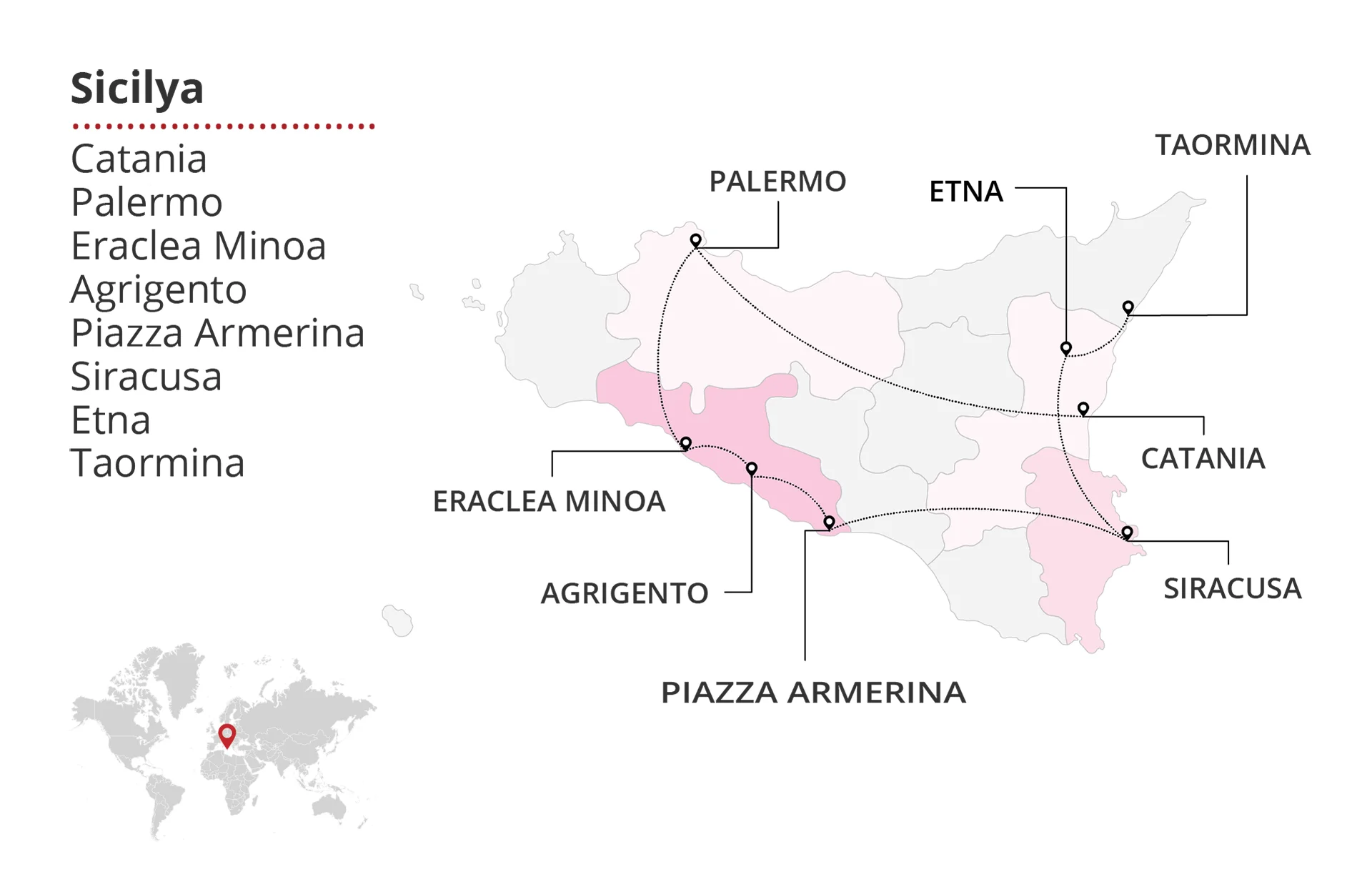 Tarihin fırtınaları yollarından günümüze yapısını bozmadan kurumayı başarmış Akdeniz’in en büyük adası Sicilya’da kadın kadına keşif, Taş yollar, dar sokaklar, denize arkadaşlık eden sahil kıyısı evleriyle ünlü balıkçı kasabası Cefalu, Kültür, mimari ve gastronomi üçgeninin ortasında 2700 yıllık tarihiyle dimdik duran, mavinin en canlı tonuna sahip deniziyle içinizi ısıtan Sicilya’nın en güzel kenti Palermo, Denizden esen serin meltemler eşliğinde sergilenen Antik Yunan tarihine ait kalıntılarıyla, doğanın ve tarihin müthiş uyumunu yansıtan Eraclea Minoa, Herkül Tapınağı gibi birçok ünlü tapınağı barındıran ‘Tapınaklar Vadisi’ Agrigento, Roma döneminin en iyi mozaiklerine ev sahipliği yapan Villa Romana Del Cesale, Yer altıyla bağlantısını hala kesmeyen, gökyüzünü ve yeryüzünü kırmızıya boyamayı alışkanlık haline getirmiş, dünyanın aktif yanardağlarının en büyüğü Etna Yanardağı...